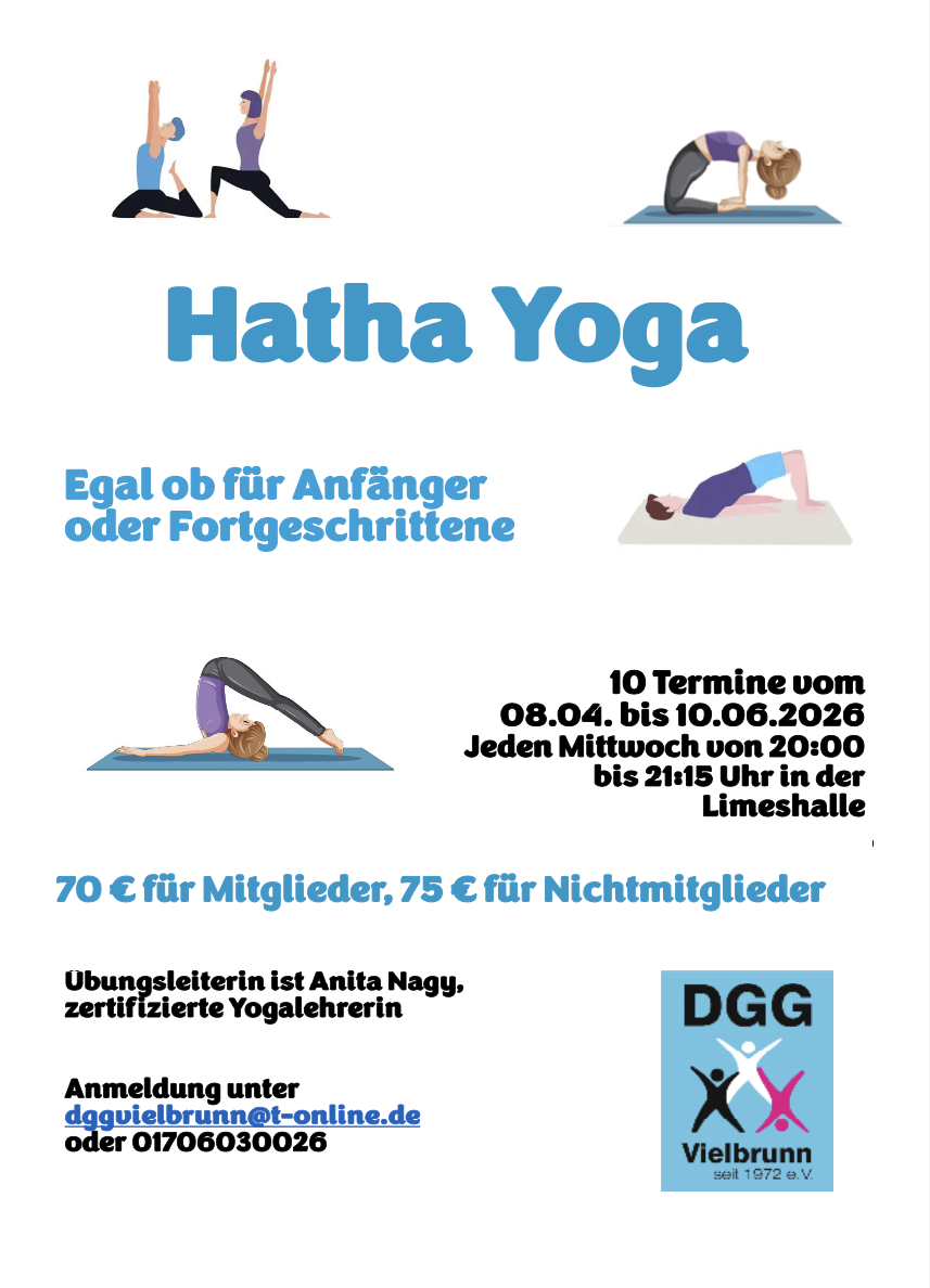 Vor Ort - in Vielbrunn in der Limeshalle - halte ich Hatha Yoga für Anfänger und Fortgeschrittene mittwochs von 20:00 bis 21:15. AUSGEBUCHT!